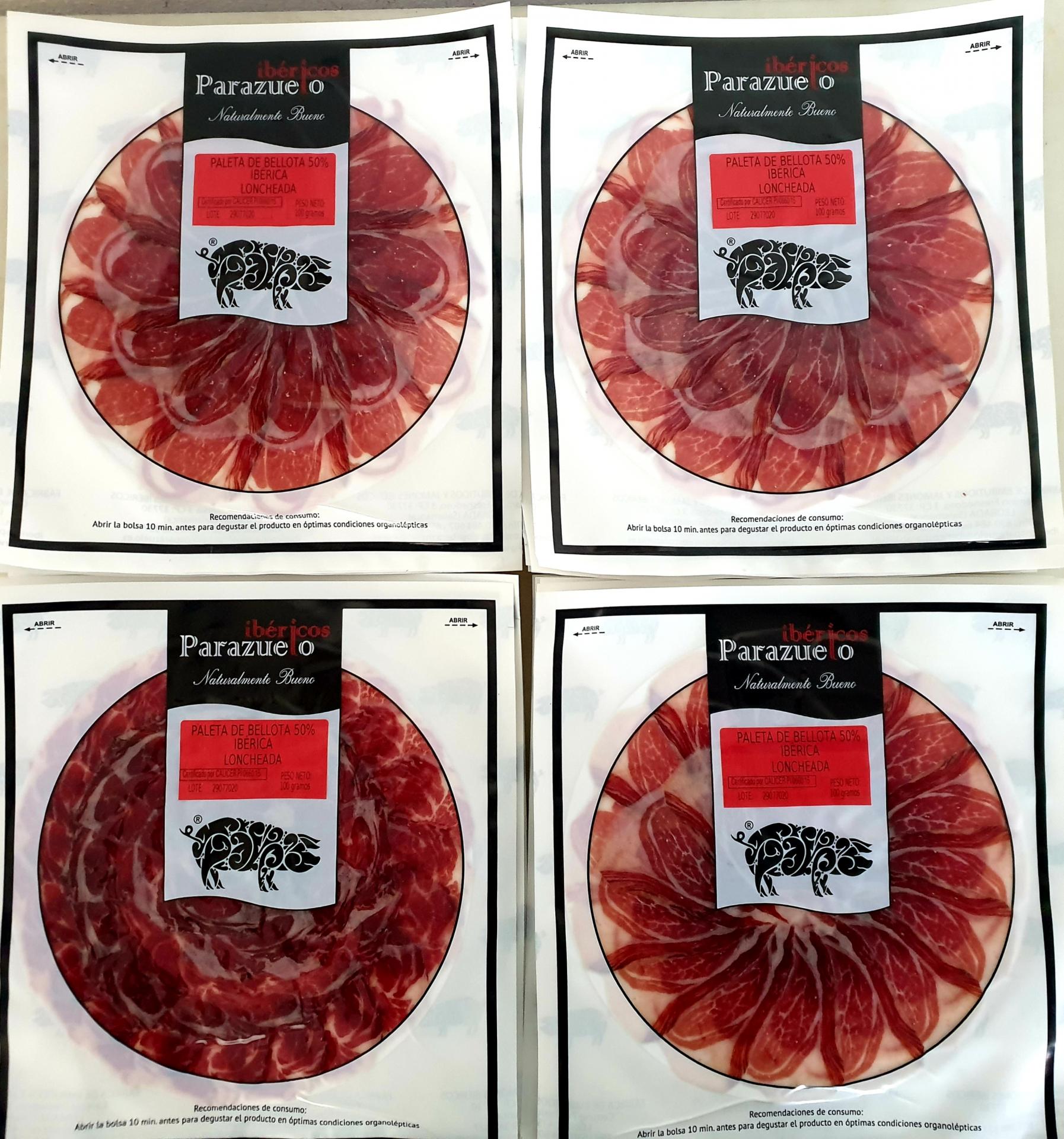 UNA PALETA DE 5,5 KG LONCHEADA A MÁQUINA Y ENVASADA EN PLATOS REDONDOS DE 100Grs AL VACÍO. EN TORNO A 22-25 PLATOS